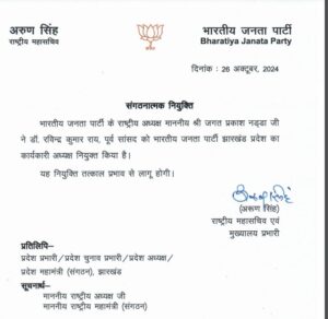 Ranchi: झारखंड में नवंबर माह में विधानसभा के चुनाव होने हैं। जिसको लेकर पहले चरण का नामांकन जारी है। इसी बीच भारतीय जनता पार्टी ने पूर्व सांसद रवींद्र राय को झारखंड बीजेपी कार्यकारी अध्यक्ष बनाया है। राष्ट्रीय महासचिव अरुण सिंह ने इसकी घोषणा की है।