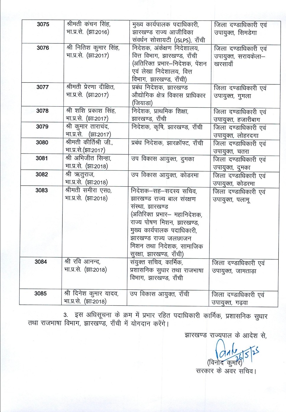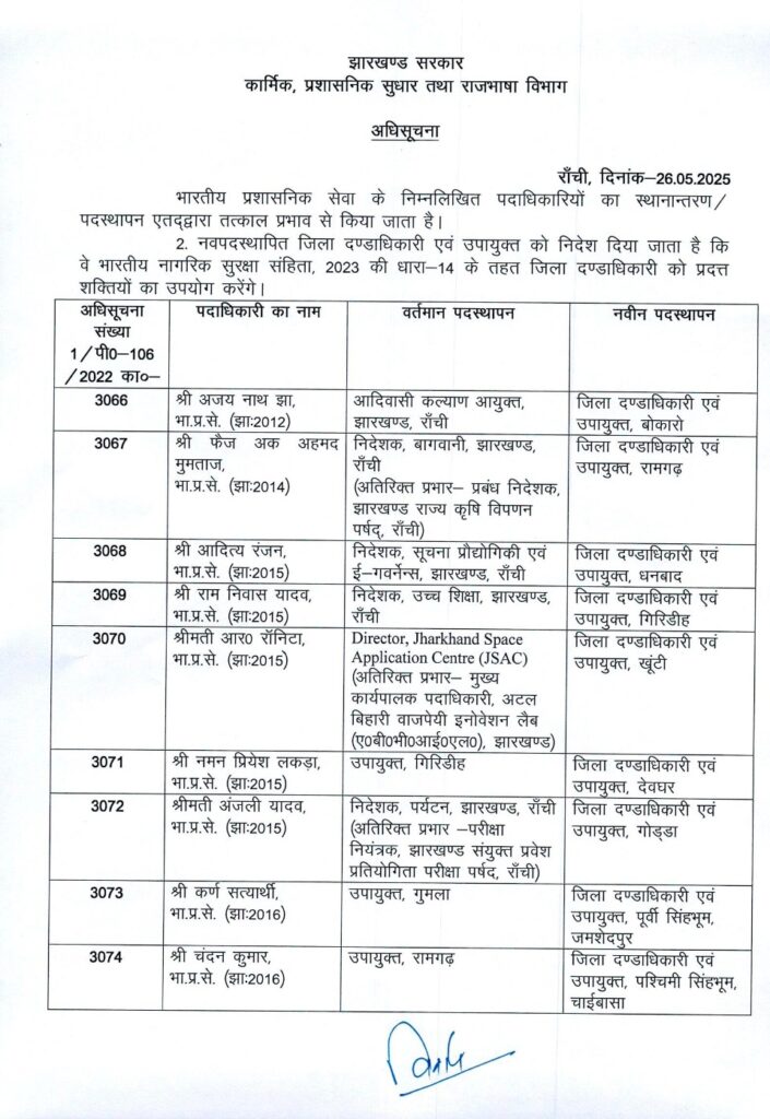 Ranchi: Jharkhand सरकार के कार्मिक, प्रशासनिक सुधार एवं राजभाषा विभाग ने भारतीय प्रशासनिक सेवा के 20 अधिकारियों के तबादले और नई पोस्टिंग से संबंधित अधिसूचना जारी कर दी है। इस फेरबदल में कई जिलों को नए उपायुक्त (DC) मिले हैं।