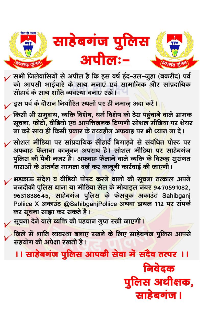 Sahibganj, 5 जून: आगामी ईद-उल-जुहा (बकरीद) को लेकर साहिबगंज जिला पुलिस (Sahibganj Police) ने आमजन से शांति, सौहार्द्र और साम्प्रदायिक एकता बनाए रखने की अपील की है। पुलिस अधीक्षक के निर्देश पर जारी इस अपील में लोगों से खासकर सोशल मीडिया पर अफवाह फैलाने से बचने, भड़काऊ पोस्ट नहीं करने, और संवेदनशीलता बरतने की अपील की गई है।