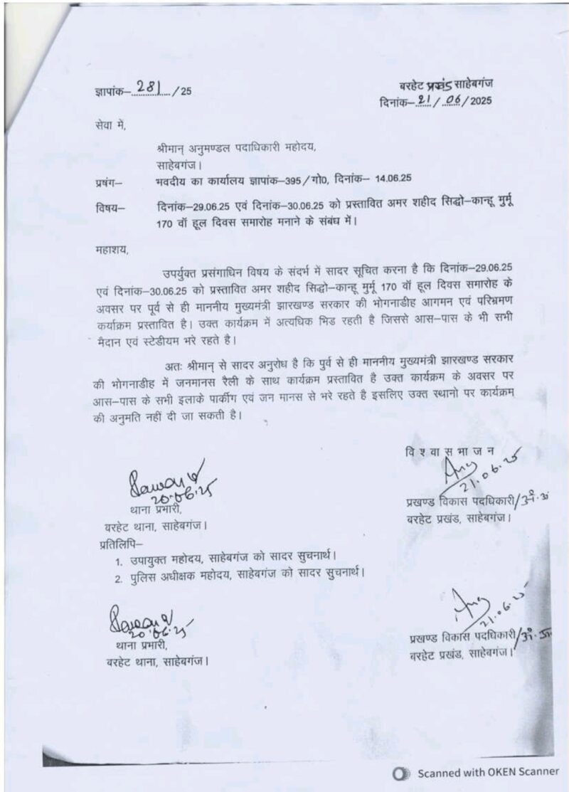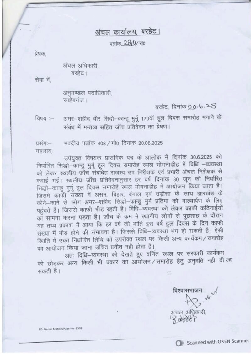 सांसद निशिकांत दुबे के ट्वीट में एक गोपनीय पत्र की प्रति भी साझा की गई है, जो अनुमंडल पदाधिकारी, साहिबगंज द्वारा जारी किया गया है। पत्र का ज्ञापांक III-19/2025 – 411, दिनांक 23 जून 2025 है, जिसमें मंडल मुर्मू द्वारा सिद्धो-कान्हू हूल फाउंडेशन के बैनर तले भोगनाडीह में आयोजित हूल दिवस समारोह के लिए अनुमति नहीं देने की बात कही गई है। पत्र में इसका कारण मुख्यमंत्री के प्रस्तावित कार्यक्रम की सुरक्षा बताते हुए थाना व अंचल कार्यालय द्वारा दी गई संयुक्त जांच रिपोर्ट (पत्रांक संख्या 280/281) को आधार बनाया गया है, जिसकी तिथि 25 जून 2025 अंकित है।